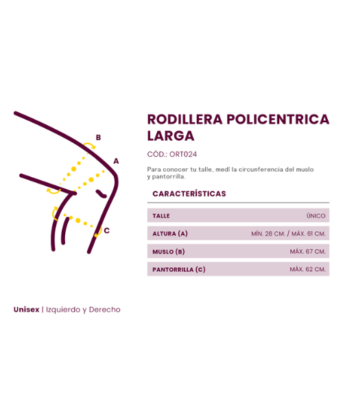 • Se compone de dos barras laterales de aluminio articuladas en forma policéntrica que permiten regular la flexión o extensión cada 10º. Acolchados interiores desmontables. Refuerzo de polietileno. Ajuste con 6 tiras de velcro.
